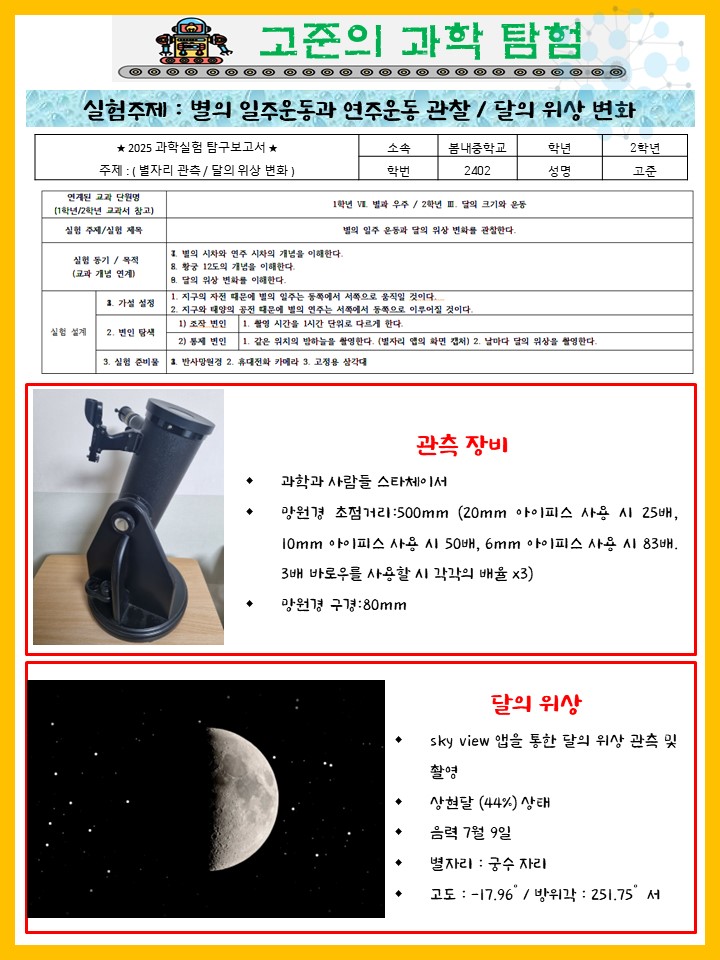 | 천체 관측(연주시차 / 일주시차) 및 달의 위상 변화 관측-37 (by 봄내중학교 - 봄내중 고준) (6) | 2025.08.11 |