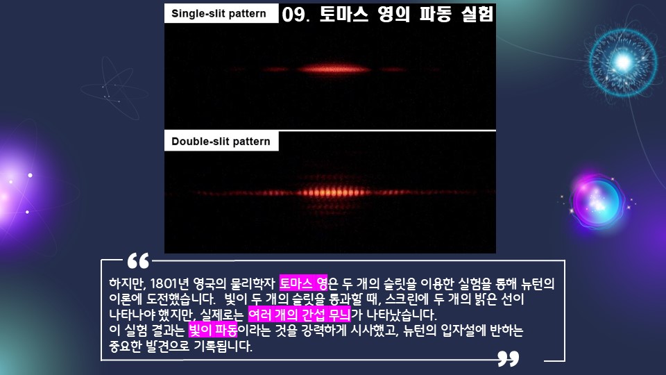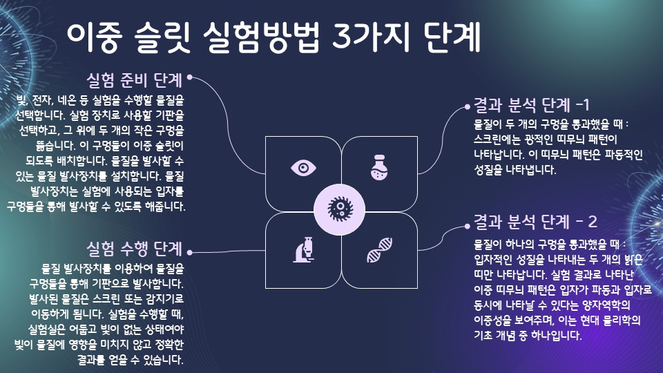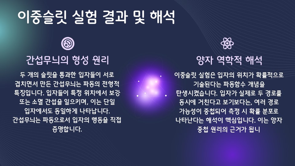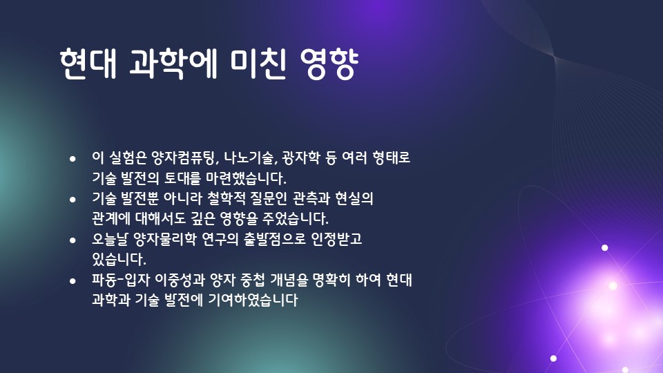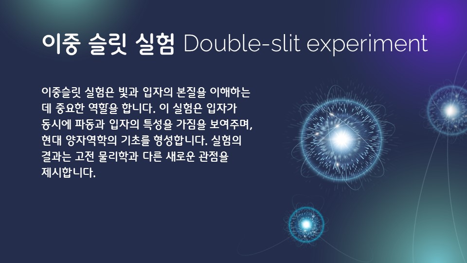 이중슬릿 실험은 빛과 전자가 입자이면서 동시에 파동의 성질을 가진다는 이중성 개념을 입증합니다. 이 실험은 물리학에서 파동-입자 이중성의 확립에 크게 기여했으며, 양자역학 발전의 핵심 토대를 제공합니다. 이중성은 현대 물리학 이론 전반에 걸쳐 필수적으로 고려됩니다.